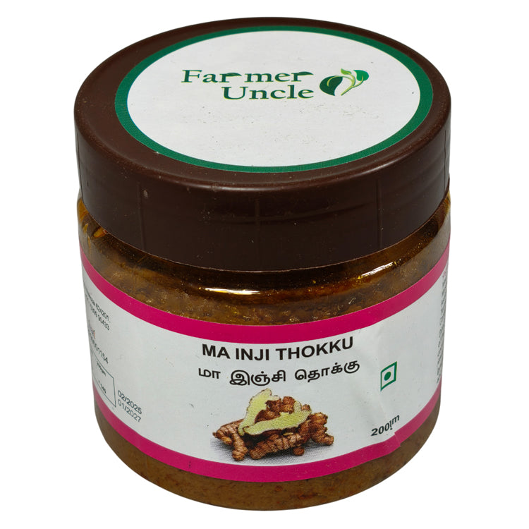 Farmer Uncle's Ma Inji Thokku (or Mango Inji Thokku) is a flavorful and aromatic traditional condiment made with the tangy, spicy combination of ma inji (wild ginger) or mango and a blend of rich spices. This thokku, a type of South Indian chutney, offers a perfect balance of heat, tanginess, and sweetness, making it a versatile accompaniment to various dishes. Whether prepared with ma inji or mango, the thokku provides both delicious flavor and a range of health benefits, making it a must-try addition to your kitchen pantry.