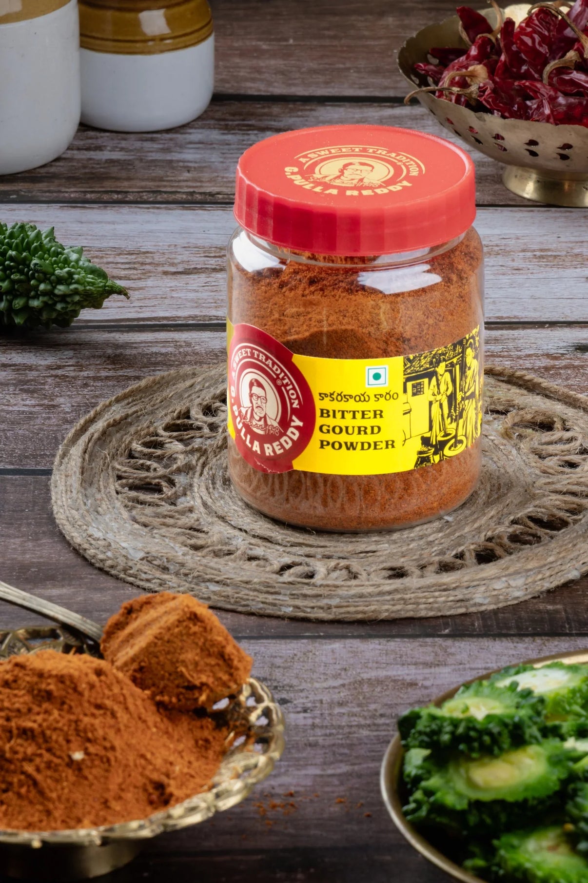 G. Pulla Reddy’s Kakarakaya Karam Powder is a distinctive Andhra-style spice blend that brings together the bold bitterness of bitter gourd (kakarakaya) with a medley of aromatic spices. This flavorful powder is designed to enhance your meals by adding a unique bitter-spicy kick, making it a perfect accompaniment to hot rice, ghee, or as a seasoning for various dishes.