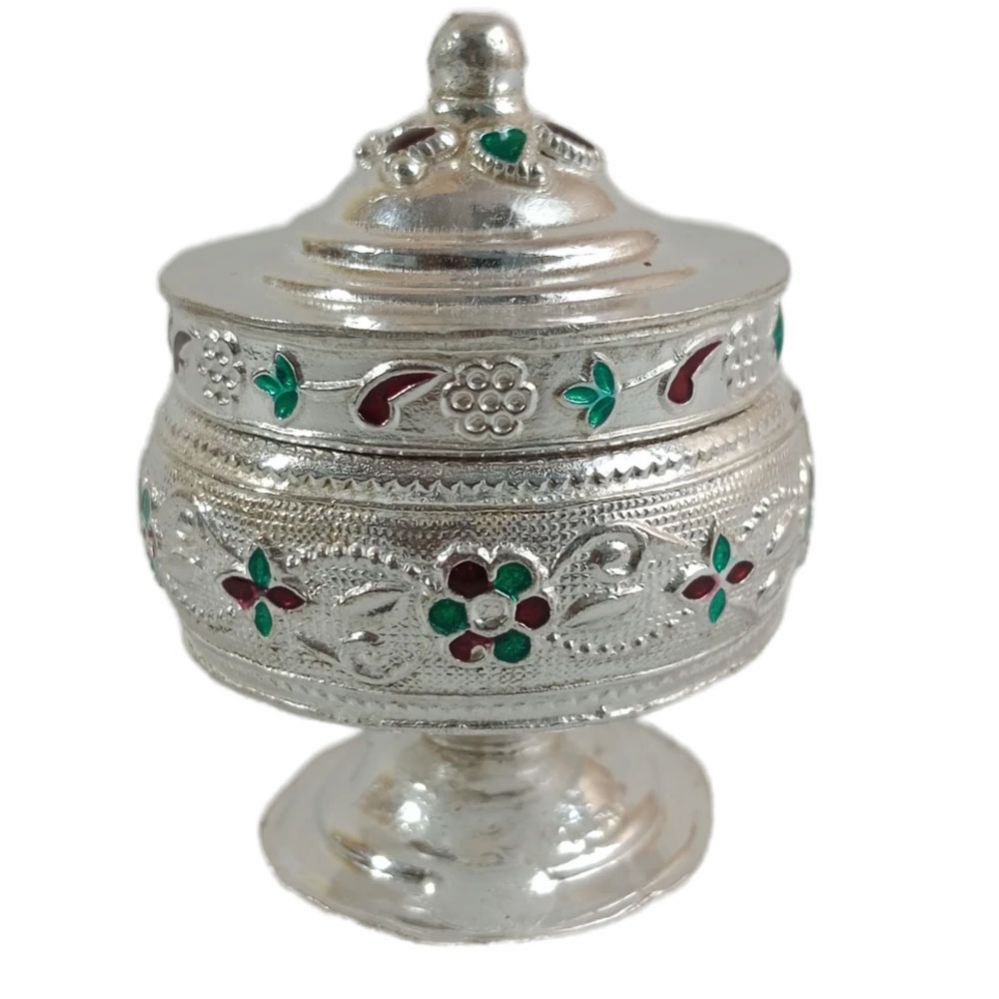 A German silver kumkum simli is a decorative container specifically designed for storing kumkum, the sacred red powder used in Hindu rituals. Crafted from a durable metal blend, it features a lustrous finish and often showcases intricate designs or engravings. This simli not only serves as a practical item for pooja ceremonies but also adds a touch of elegance to any altar or spiritual space. Its aesthetic appeal and functionality make it a cherished accessory for devotees.