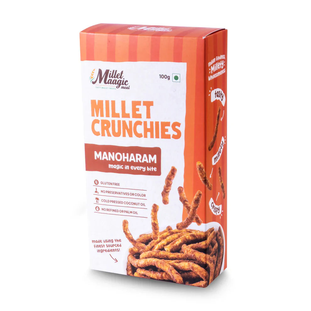 Discover the sweet and savory delight of Millet Manoharam, made with a perfect blend of foxtail millet (thinai), kodo millet (varagu), and millet besan. Infused with the rich taste of palm jaggery and crafted with cold-pressed coconut oil, these crunchy treats are free from preservatives and full of natural extracts. Enjoy a traditional, guilt-free indulgence with every bite!