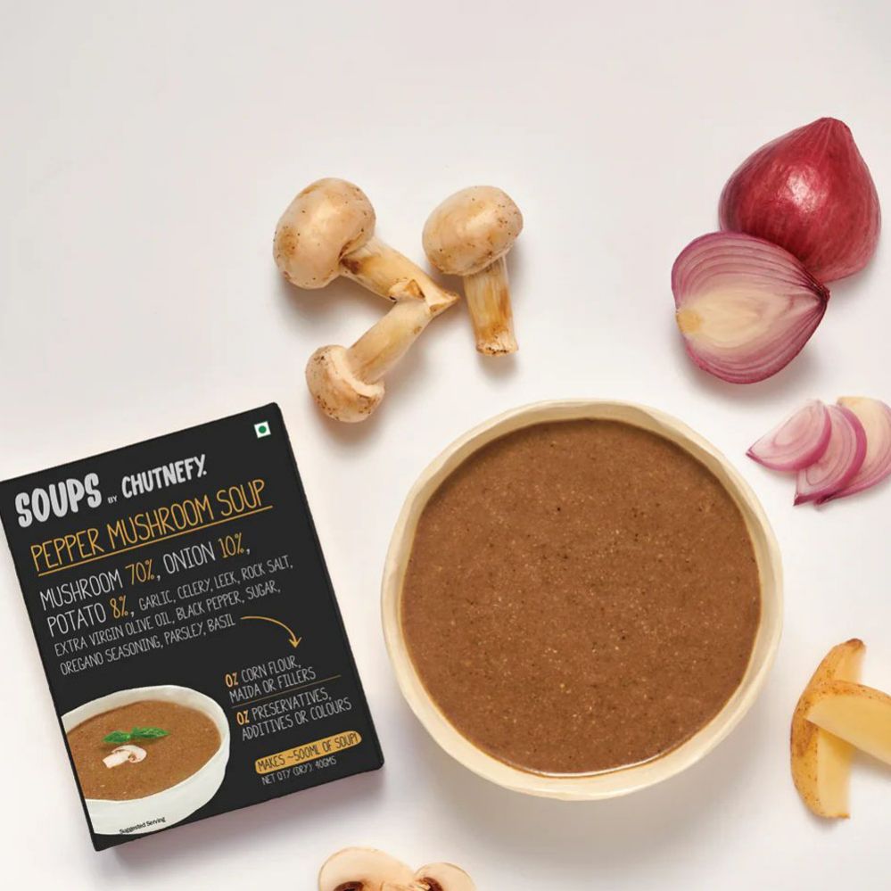 Peppery, earthy and invigorating. That's probably the best way to describe our unique Pepper Mushroom Soup made in its truest and purest form - because unlike any other instant soup in the market, we add nothing but natural ingredients, with no Corn starch, Maida, Fillers or the other things you'd never otherwise use at home. (And that's why we've put the ingredients right up front - 'cos we've got nothing to hide!)