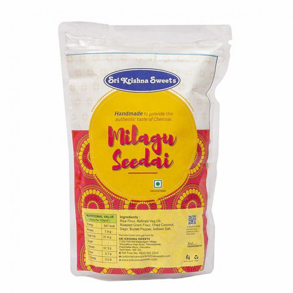 Krishna Sweets' Milagu Seedai is a traditional South Indian savory snack made from rice flour, urad dal flour, and black pepper. It's part of the Seedai family of snacks, which are known for their crispy and crunchy texture. Milagu Seedai is particularly distinguished by the use of black pepper (milagu) which adds a spicy, peppery kick to the otherwise mild, crunchy snack. It is often enjoyed during festivals like Krishna Jayanti or Diwali and is a favorite for those who love savory, spicy treats.