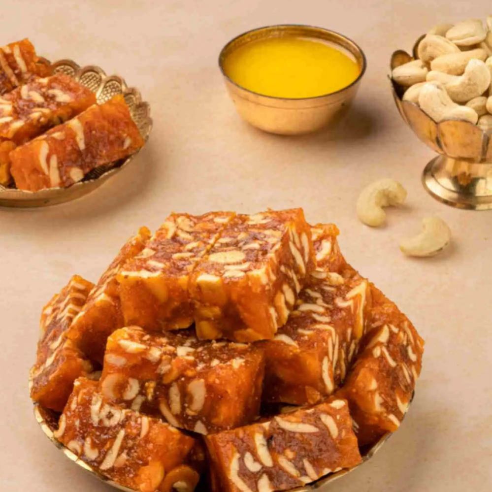 This halwa is known for its luxurious consistency, with the goodness of dry fruits like cashews, almonds, and raisins, making it both nutritious and delicious.